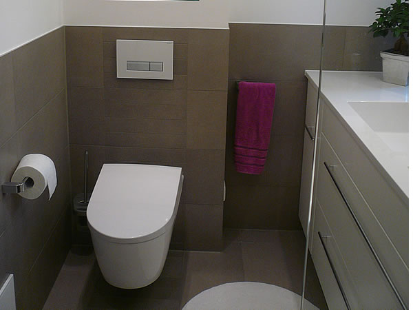 Mit einer auf Maß angefertigte bodenstehende Waschtischanlage und einem großen Spiegelschrank wurde die maximale Staufläche erreicht. Ein besonderer Luxus ist außerdem das eingebaute Aquaclean-WC.