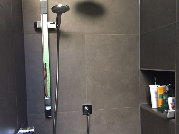 Das alte Parkett wurde im vorden Bereich erhalten, nur im alten Badbereich wurde der Boden gefliest, da sich hier auch die bodenebene Dusche befindet. Eine Trockenbauwand ersetzt eine Glas- Duschabtrennung, hier eingelassen befindet sich auch ein Unterputz-Mülleimer. Am WC wurde zusätzlich eine Intim-Dusche montiert.