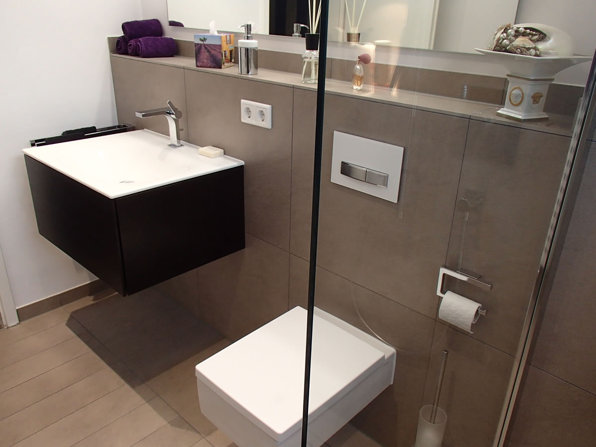 Hier fühlen sich die Gäste wohl! Eine bodenebene Duschanlage wurde vor das Fenster platziert. Großformatige Feinsteinzeug-Fliesen sind mit einem Riemchen-Band, welches sich über Boden und Wand zieht, aufgelockert. Die geradlinigen Objekte unterstreichen das zeitlose Design.